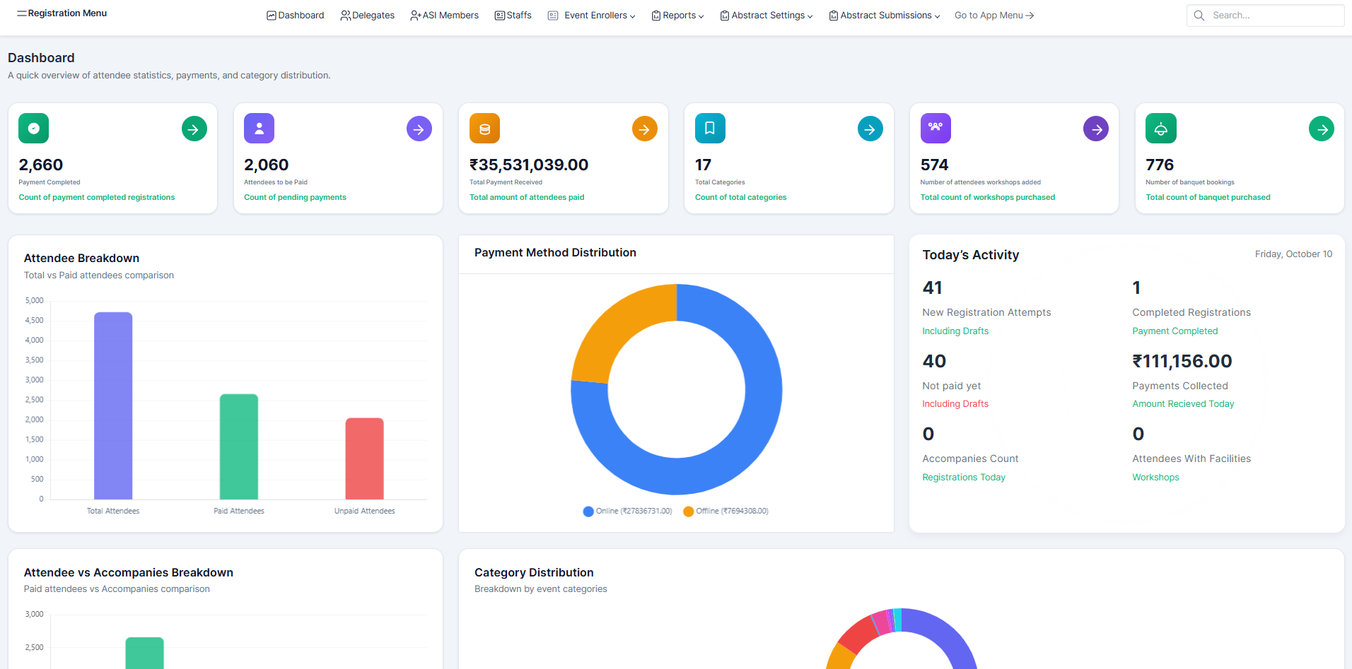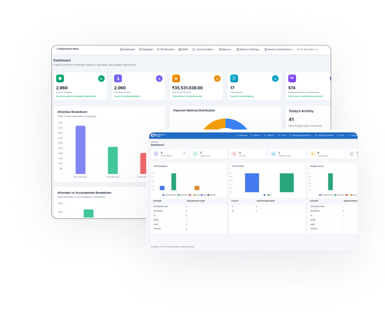 ConferencePrime is primed for every software requirement a conference can demand, be it a hybrid or an in-person event. Delegates will be treated to a flawless event stream, right from online registrations to activity monitoring, everything automated. Post event analytics become a pleasure instead of a nightmare with figures at your fingertips, literally.